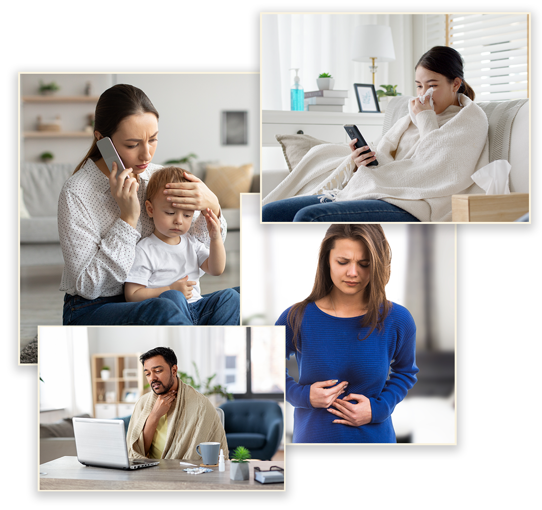 Symptoms like colds, sinus infections, coughs, rashes, bites/stings, digestive issues, or other acute problems.